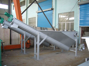 砂水混合物從頂部的法蘭接管進(jìn)入儲(chǔ)液箱內(nèi)。箱內(nèi)專門設(shè)計(jì)的散水盤使水匯集于下水槽。砂水混合夜中,砂石逐漸沉淀于下部的螺旋u形槽內(nèi)?招膸铰菪徛D(zhuǎn)砂礫推向上出口,自然脫水排除。